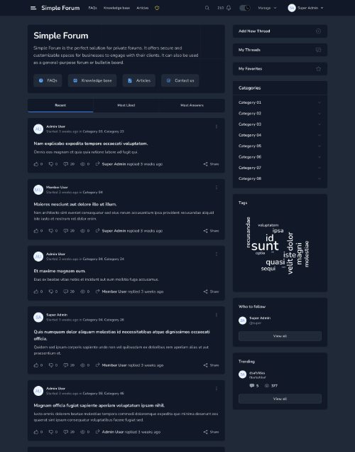 Simple Forum is designed with simplicity, user experience and responsiveness in mind, ensuring that your forum looks and functions flawlessly across all devices. Whether your users access the forum from desktops, tablets, or smartphones, they will enjoy a seamless and intuitive browsing experience.